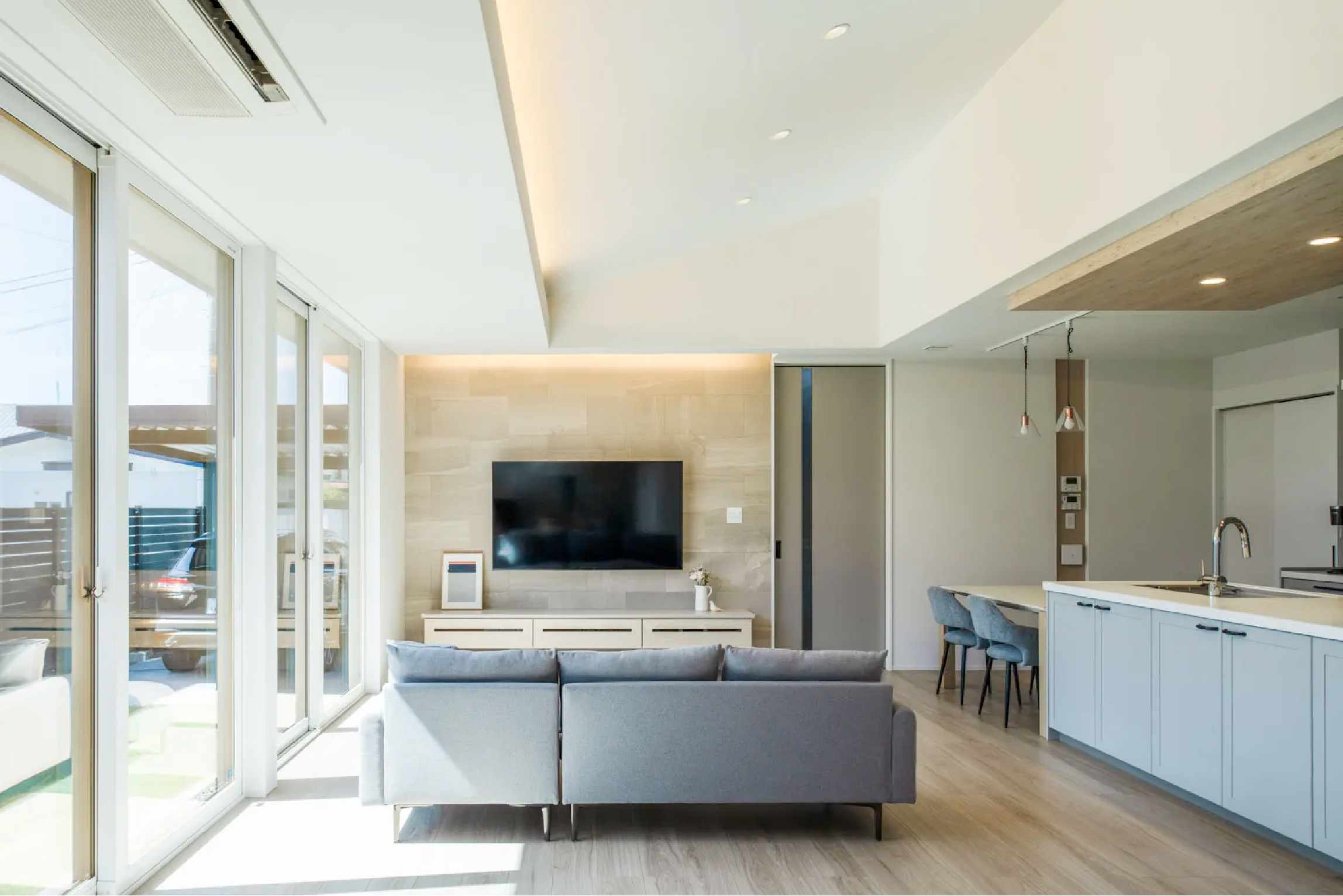 施主様のご要望をもとに、キッチンを中心とした回遊動線を採用。水まわりやパントリーをLDKの背面にまとめ、家事効率の良いプランを実現。動線に沿って十分な収納スペースも確保しました。